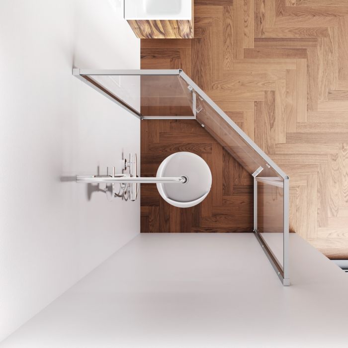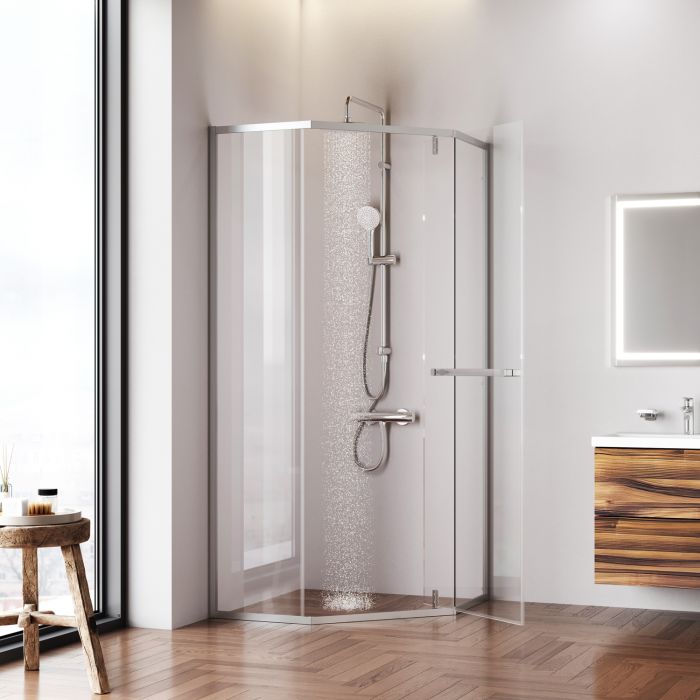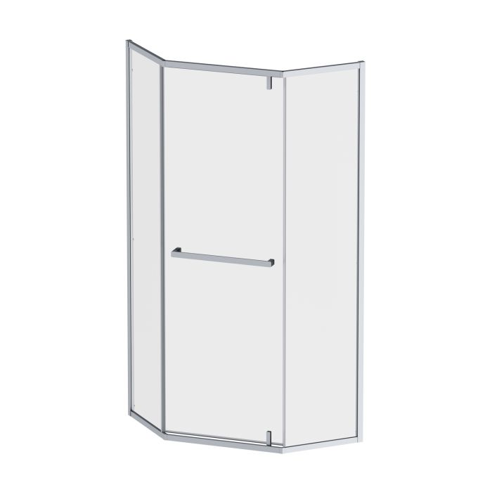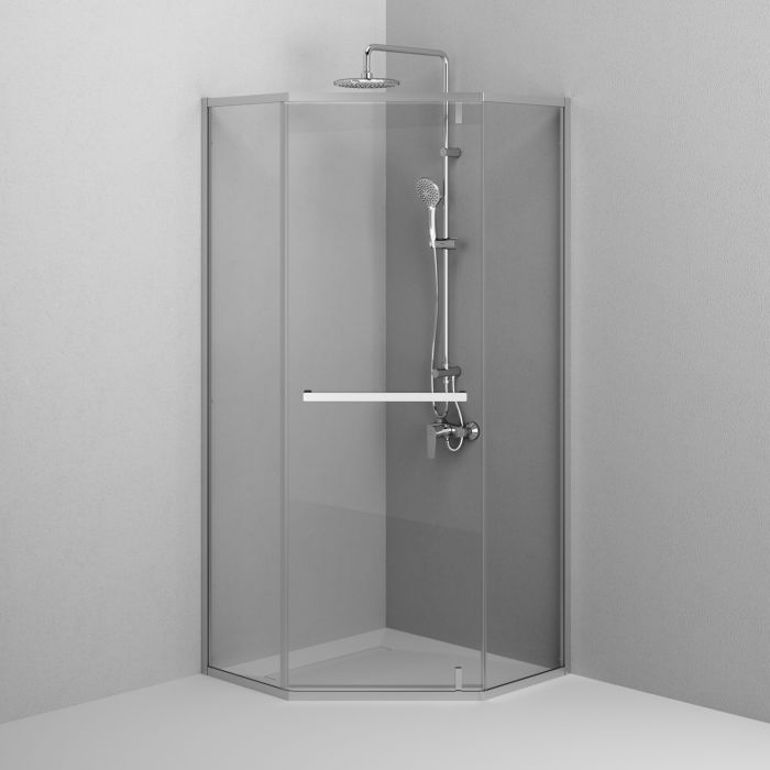 Душова огорожа Gem п'ятикутної форми з одними відчиненими дверима. Профіль алюмінієвий, колір матовий хром, скло прозоре 5 мм