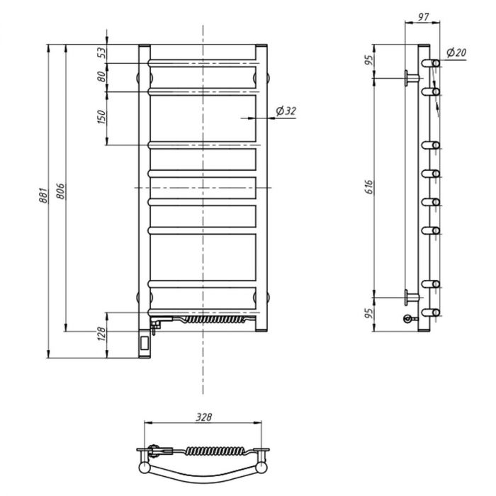 Виготовлений сушка для рушників із міцної сталі із захисним покриттям, стійким до корозії, механічним впливам та підвищеній вологості, що гарантує довговічність та збереження привабливого зовнішнього вигляду протягом усього терміну експлуатації. Розміри пристрою становлять 360 мм завширшки і 800 мм заввишки, що робить його компактним і зручним для встановлення в приміщеннях з обмеженим простором. Праве підключення полегшує монтаж та інтеграцію до існуючої системи опалення або електропостачання.