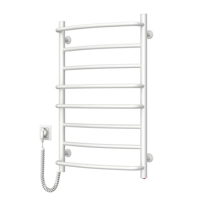 Розміри рушникосушарки становлять 530х800 мм. Конструкція включає вигнуті горизонтальні поперечини, з'єднані вертикальною стійкою з лівого боку. Така форма забезпечує зручне розміщення рушників та рівномірний розподіл тепла по всій поверхні. Це сприяє швидкому сушінню текстилю та підтримці комфортної температури у приміщенні.