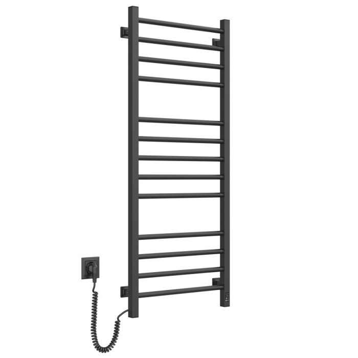 Полотенцесушитель Navin Классик Квадро 500х1200 Sensor левый с таймером, чёрный муар 12-216153-5012 представляет собой современное электрическое устройство для сушки полотенец и дополнительного обогрева ванной комнаты. Модель отличается увеличенной высотой и функциональностью, что делает её удобным решением для ванных комнат среднего и большого размера.