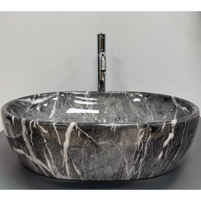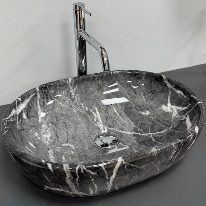 Чаша умывальника имеет продуманную форму с плавными внутренними линиями и достаточной глубиной, что способствует эффективному отводу воды и снижает разбрызгивание при использовании. Гладкая поверхность облегчает уход за изделием и помогает поддерживать его аккуратный внешний вид на протяжении длительного времени. Эффект оникса придает модели выразительность, глубину и текстуру, делая её декоративным элементом, способным оживить интерьер и добавить ему характер.