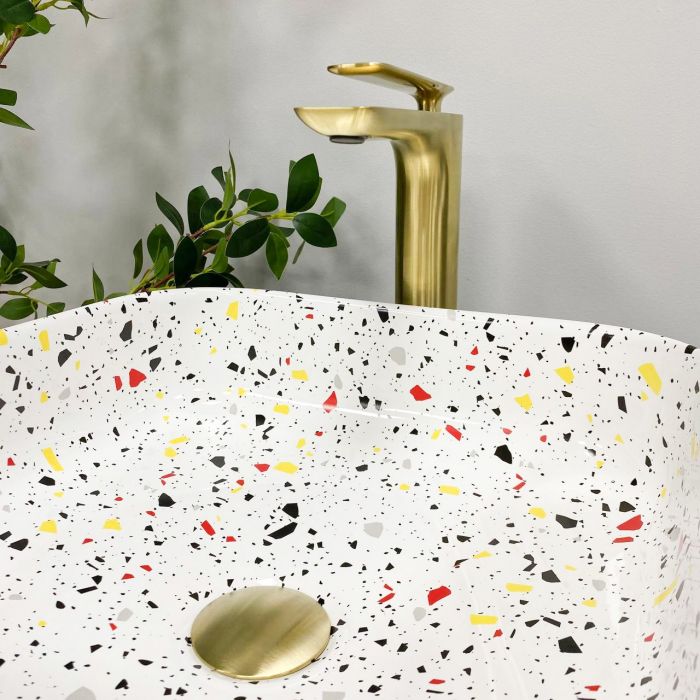 Умивальник VBI ALGHERO TEĎZO S накладний VBI-013302 - це стильне та сучасне рішення для вашої ванної кімнати, яке поєднує в собі елегантний дизайн та практичність. Виготовлений із високоякісного композитного матеріалу з ефектом терраццо, цей умивальник привносить в інтер'єр унікальність та характер, створюючи атмосферу затишку та сучасності.