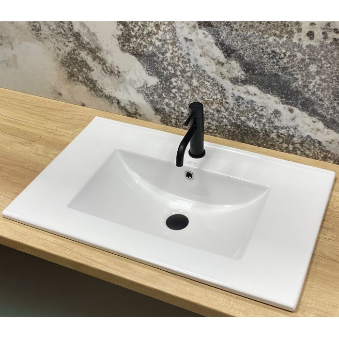 Конструкція умивальника передбачає врізний спосіб встановлення в стільницю або тумбу. Такий монтаж забезпечує акуратний та завершений вид зони вмивання, а також стійку фіксацію виробу. Умивальник із шириною 75 см є оптимальним варіантом для ванних кімнат середнього та невеликого розміру, забезпечуючи комфортну робочу поверхню без зайвого зайняття простору. Така компактна, але функціональна форма робить модель зручною у повсякденному використанні.