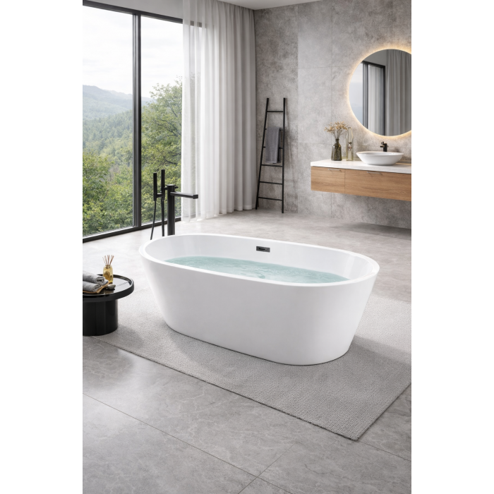 Окремий формат установки надає широкі можливості організації простору. Ванна може бути розміщена як біля стіни, так і в центральній частині приміщення при підготовці комунікацій. Така конструкція забезпечує зручний доступ та візуальну легкість, створюючи відчуття простору. Стандартне розташування зливного отвору забезпечує сумісність із поширеними системами зливу та переливу.