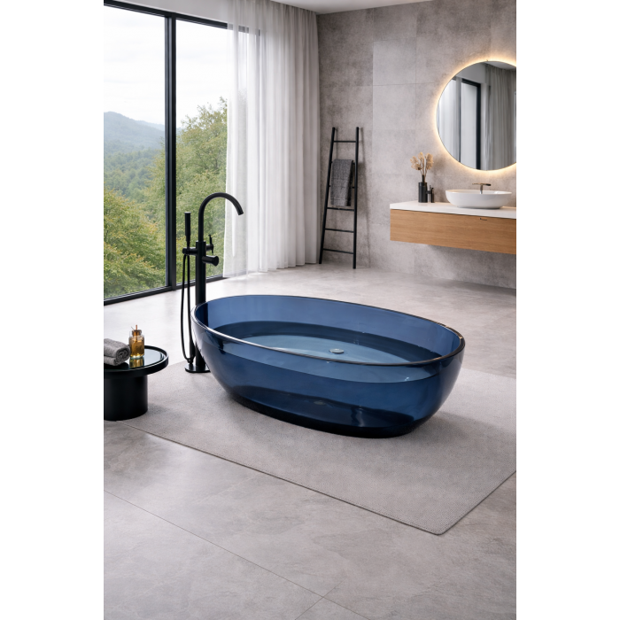 Модель виготовлена ​​із загартованого скла з внутрішнім акриловим або композитним шаром, що забезпечує міцність, стійкість до впливу вологи, перепадів температури та побутових засобів для чищення. Матеріал має низьку теплопровідність, завдяки чому вода довше зберігає комфортну температуру. Гладка поверхня скла запобігає накопиченню забруднень та полегшує догляд, а насичений синій колір надає ванні ефектного та сучасного вигляду, створюючи привабливий візуальний акцент в інтер'єрі.