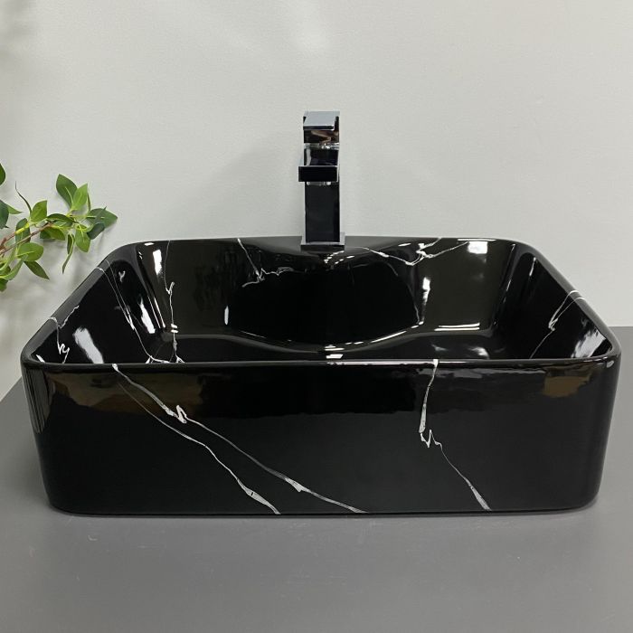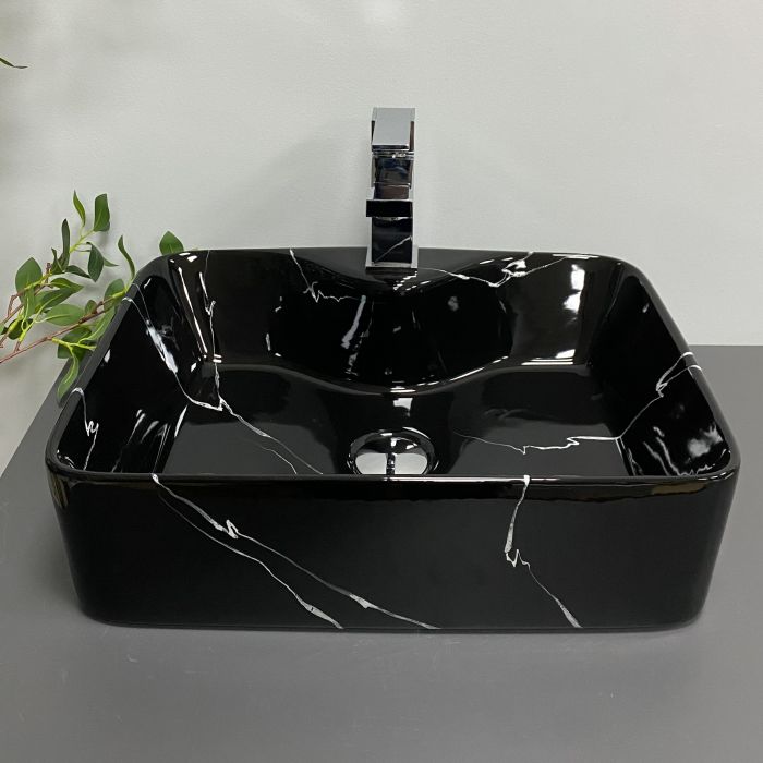 Чаша умивальника має продуману геометрію, комфортну глибину та плавні внутрішні лінії, що сприяє ефективному відводу води та знижує розбризкування при використанні. Глянцева поверхня не лише надає естетичної привабливості, але й полегшує догляд, дозволяючи легко підтримувати чистоту та доглянутий зовнішній вигляд виробу протягом тривалого часу. Чорний мармуровий ефект робить модель виразним акцентом у ванній кімнаті та легко поєднується із сучасними змішувачами, аксесуарами та меблями.