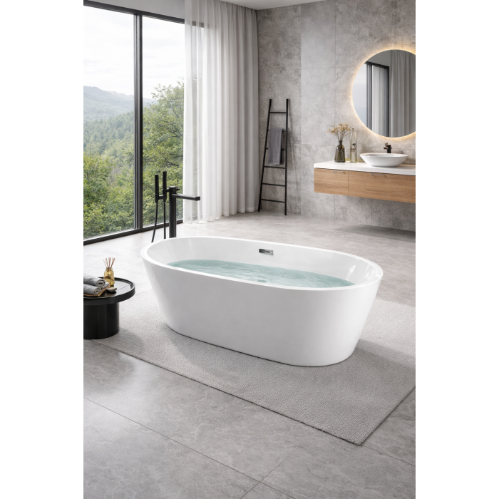 Окрема конструкція дозволяє встановити ванну без прив'язки до стін, забезпечуючи свободу у плануванні простору. Таке розміщення створює візуальну легкість та дозволяє організувати зручний доступ з усіх боків. Стандартне розташування зливного отвору забезпечує сумісність із поширеними системами зливу та переливу.